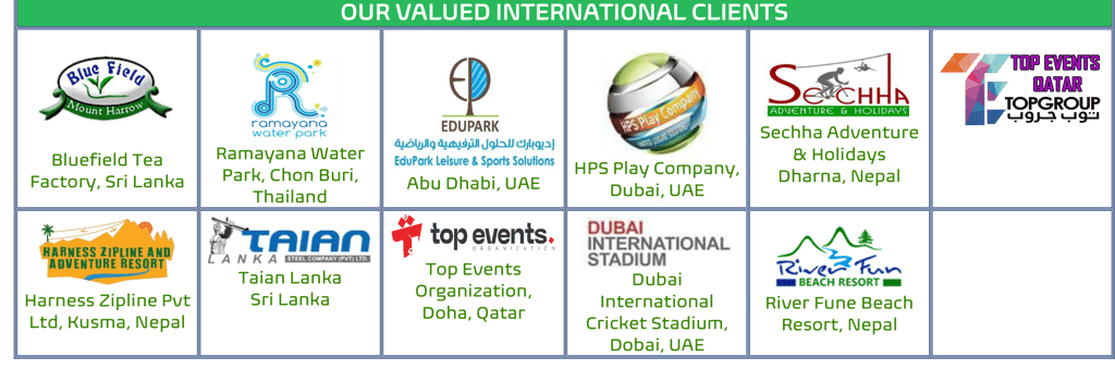 250+ Zip Line installations in India, Qatar, Dunai, Nepal, Sri Lanka, Bangladesh, Thailand